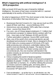 With out doubt 2018 was the year of denial for Artificial Intelligence. Any piece of bad news connected with A.I. seemed automatically to be worthy of front line news. So what is happening in 2019? The short...